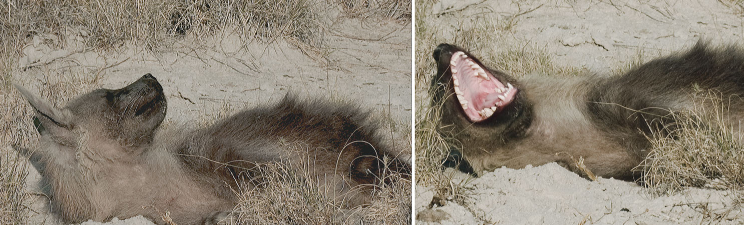 Brown Hyena napping & yawning-(dbl image): There was plenty of light left when these two pictures were taken. I couldn't resist such a photographic opportunity in daylight. Again, the typical husky hyena jaw and mouthful of strong teeth. [Botswana].