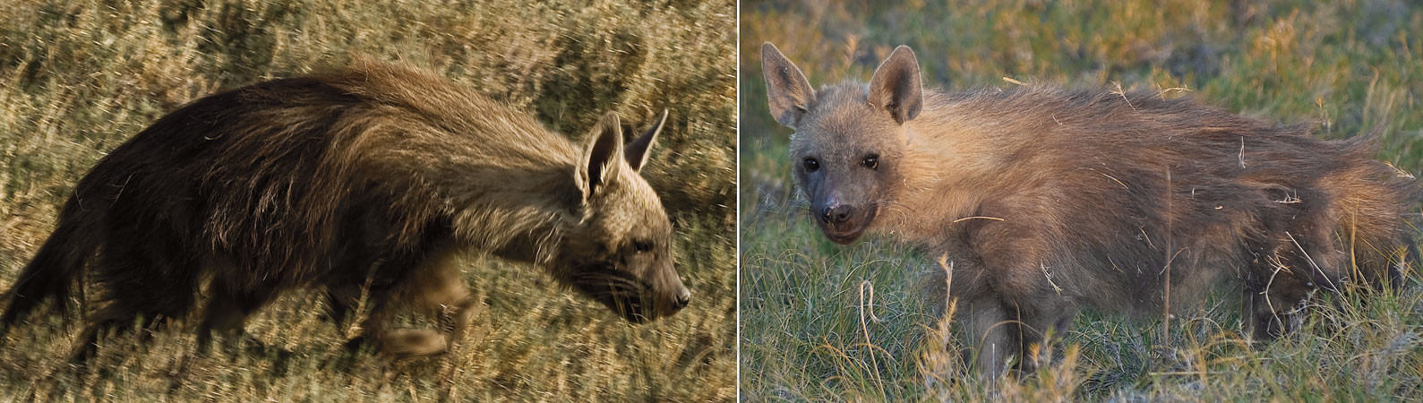 Double image of a Brown Hyena male, walking and sitting. The L image illustrating the posteriorly slanting body, characteristic of hyenas caused by the front legs being longer than the rear ones. R, the transverse black bars on the forelegs, typical of this species, is well shown. [Botswana].
