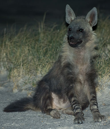Brown Hyena male sitting on his haunches: Previously, many times I have caught glimpses of this animal, but they always fled as soon as they saw me. Photgraphing this animal up close is a very unusual experience that has resulted because of the animal's having been acclimated to humans by a research team. I admit taking advantage of this opportunity. (Please see captions on previous images). [Jack's Camp, nr Central Kalahari, Botswana].