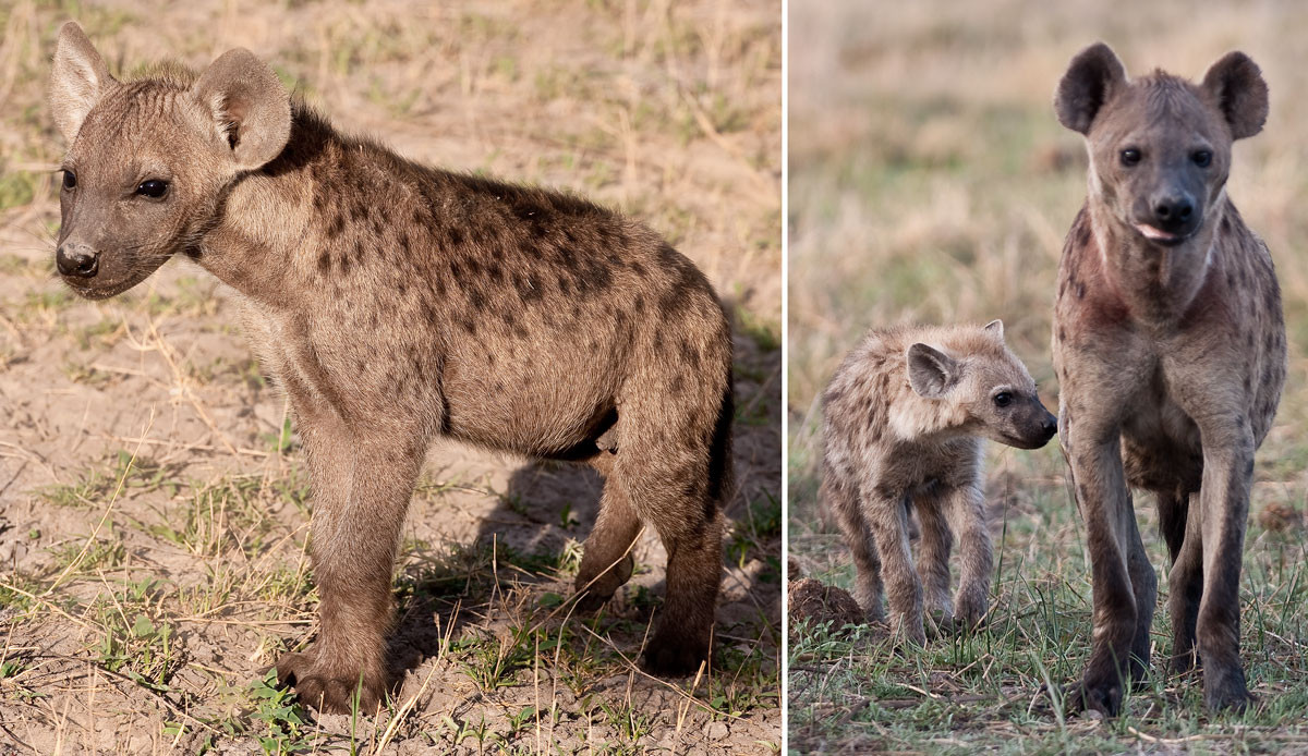 A very young baby (4-6 weeks) Spotted Hyena with its mother at the entrance to their burrow. Hyenas have superb night vision. Taken with flash. [S. Luangwa NP, Zambia].