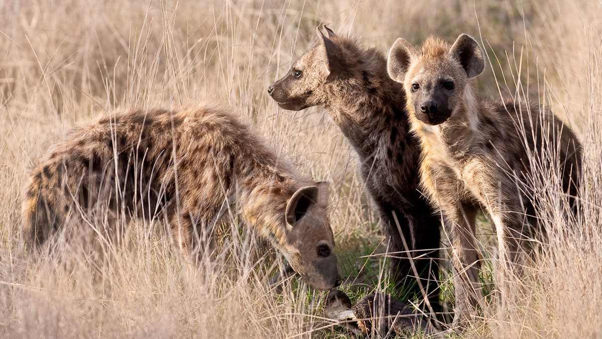 The Spotted Hyena have a custom which requires a junior male member of a family to greet an older or important male member of the clan by performing fellatio on him.This and the next image depict that act. [Botswana].