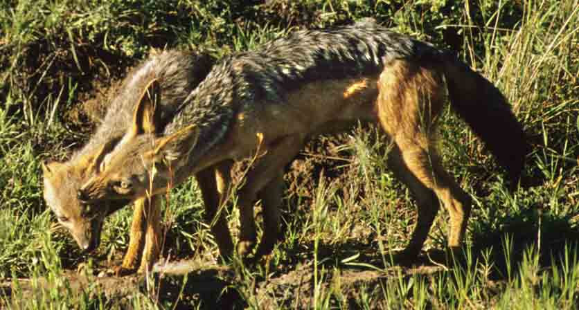 The male (foreground) Blackbacked Jackel playfully biting his mate. [Serengeti, Tanzania].