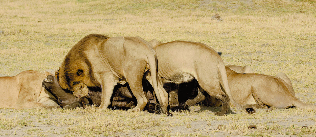 There were five Lionesses: one Lioness is crushing the buffalo's throat, while the others are working to open the abdomen. [Duba Plains, Botswana].