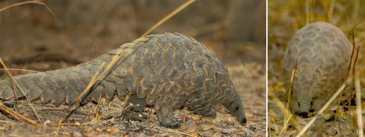 A double image of a Pangolin-lat and frontal views. The front legs are usually not used for weight-bearing and are retracted to protect the front claws, essential for digging up ants or to open up termite mounds. Its keen sense of smell enables it to locate insects in their burrow. [Lafupa River Area, Zambia].