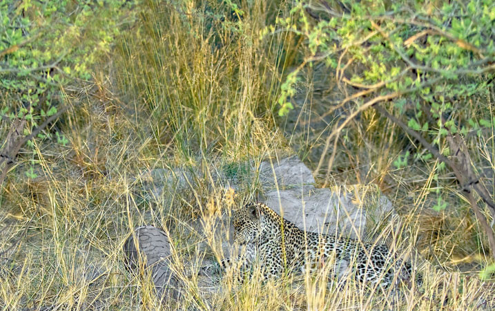 Pangolin & Leopard: This is a shot of a most unusual event: A pangolin (its back resembles a tire tread) is walking right in front of a young female leopard of about 2-1/2 years. The young cat obviously wanted to play with the pangolin. She couldn't have injured the pangolin; indeed, she herself might have been badly cut by the sharp edges of the plates, but the pangolin wasn't interested. It just wanted to get into the security of its burrow (dark area, L upper-1/3rd). Maybe our presence influenced its decision.[Gomoto River Area, Botswana].