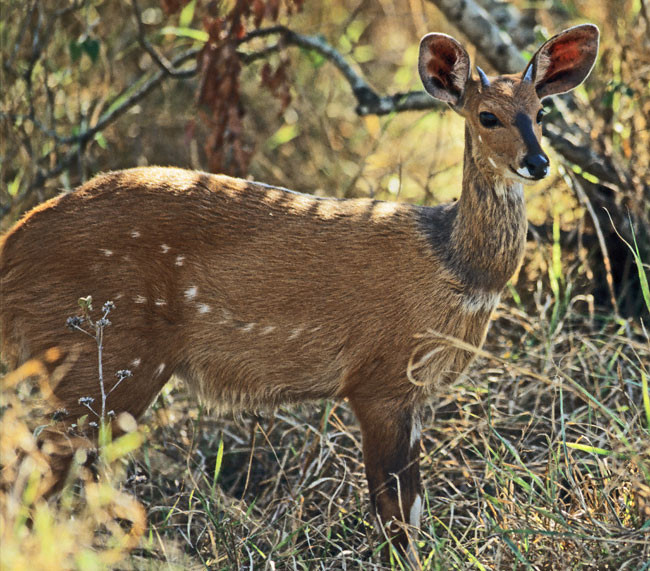 Juvenile male Bushbuck in the woodlands. Note the short horns. [Sabi Sabi Marine Camp, South Africa].