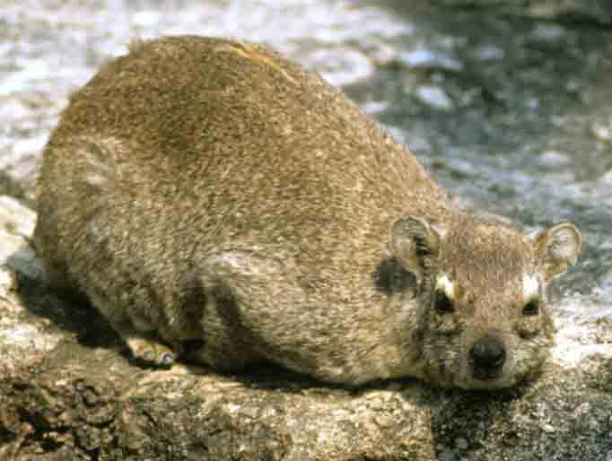 A female Rock Hyrax with her youngster on a small kopje It is not possible to sex these animals grossly, because the testes are internal. There is another species: The Tree Hyrax, whose fur is finer and are said to have a better disposition. A Hyrax is a small animal (a male weighs about 10 lbs.). It is a very distant relative of the elephant. [Masai Mara, Kenya].