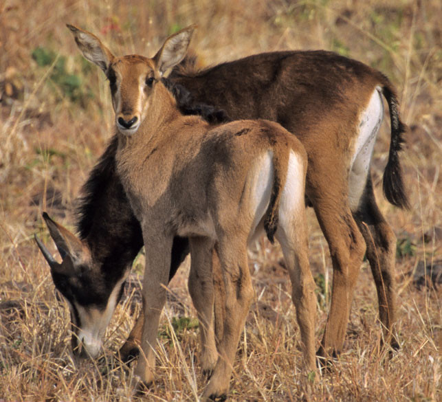 - One very young Sable Antelope colt about 2-3 weeks old that has not yet developed any horns. There is an older juvenile standing behind. [Zimbabwe].