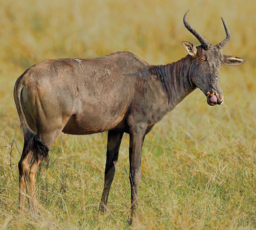 The Tsessebe of Southern Africa and the Topi of East Africa are the swiftest runners of the antelopes. These two species are related. Both have the powerful shoulder muscles & the black patches on their shoulders and nose.These are a pair, the female is in front. Both sexes bear horns. [Chobe NP, Botswana].