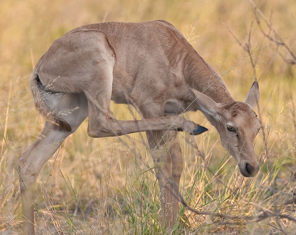 A Tsessebe pauses to scratch his head. Same juvenile as in previous image. [Chobe NP, Botswana].