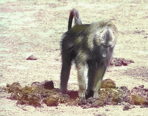 Baboon male sorting through elephant dung. He's looking for some tubers or roots to eat. Because elephants are poor digesters of what they ingest,, many species find their dung to be a good food-source. [Zimbabwe].