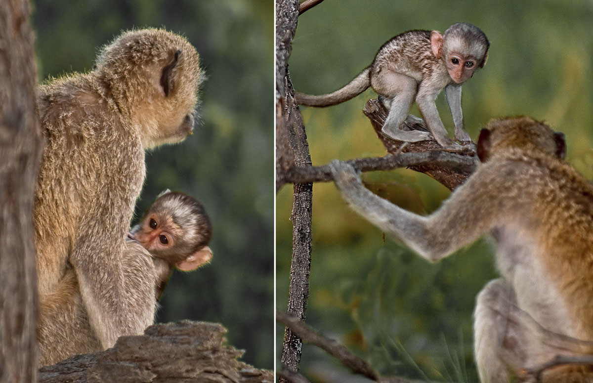 Two views of the same Vervet mother & baby (about 6 weeks). It is always amusing to watch the youngsters scamper around and play with their peers.[Botswana]....