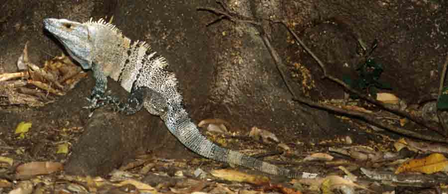 I was very lucky to catch this Green Iguana on a tree trunk. Its color is not the usual strong green, because it might be an immature, or because it's blending with the tree. Most of the time they are high up in a tree. It was already dark, and so flash was nesessary. [Costa Rica].