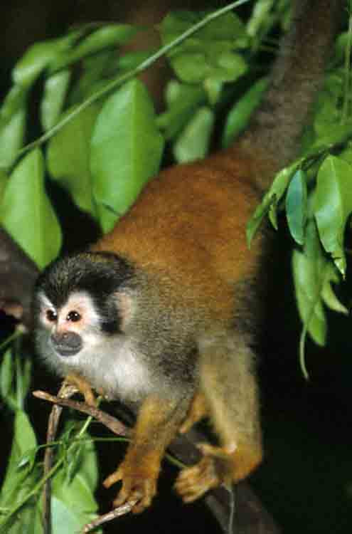 A Squirrel Monkey, on a little branch, is a very small and very agile creature. I have watched them walk along a thin telephone wire as though it were a stout branch. [Costa Rica].